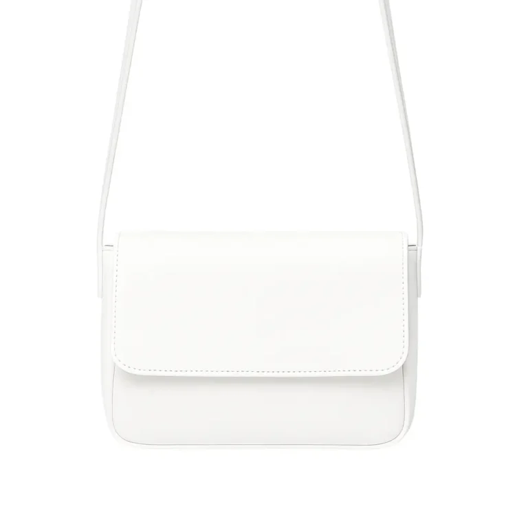 Minimalist crossbody bag in white with adjustable strap & magnetic closure. Shop Alif Bags Pakistan for stylish & versatile women’s handbags.